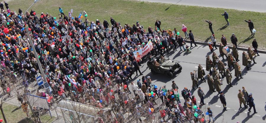 В составе колонны шествовали ветераны, оркестр и барабанщицы ансамбля «Виват, Россия!», ехал ретро-автомобиль, шли курсанты с баннером «День Победы», а за ними следовал Бессмертный полк. После шествия портреты были установлены на стадионе школы № 634, где каждый мог посмотреть на фотографии ветеранов и сделать памятную фотографию.