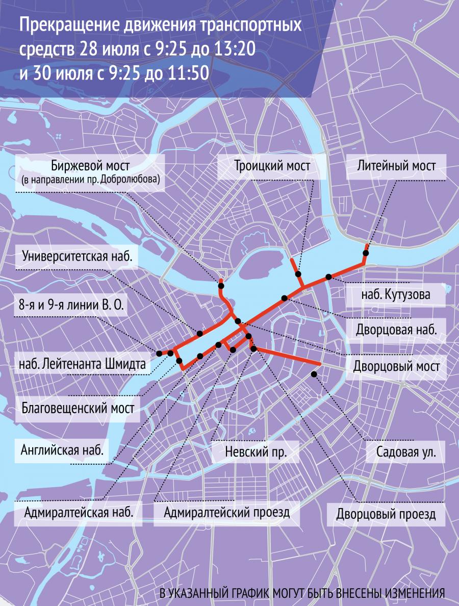 28 июля с 09.25 до 13.20 и 30 июля с 09.25 до 11.50 прекращается движение по Благовещенскому, Дворцовому, Литейному, Троицкому мостам, Адмиралтейскому проезду, Адмиралтейской наб., Английской наб. - от Адмиралтейской наб. до Благовещенского моста. Возможны ограничения движения на набережных от Литейного до Дворцового и Биржевого мостов, а также на примыкающих улицах с интенсивным пешеходным движением.