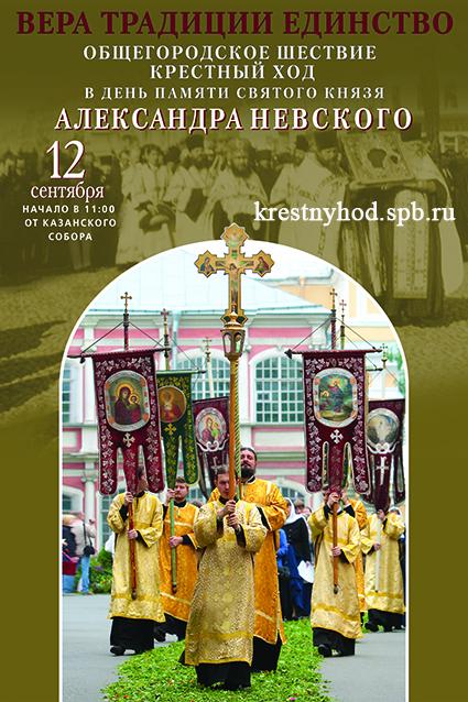 В 11.00 начнется общегородской праздничный крестный ход по Невскому проспекту от Казанского собора к площади Александра Невского. В 12.00 состоится малый крестный ход с мощами святого благоверного князя Александра Невского из Свято-Троицкого собора Лавры на площадь Александра Невского. В крестном ходе, который возглавит митрополит Санкт-Петербургский и Ладожский Варсонофий, примут участие: духовенство Санкт-Петербургской митрополии, представители православных приходов Санкт-Петербурга и области, общественные организации, учащиеся духовных школ, православные братства, представители православных общин разных городов России и горожане.