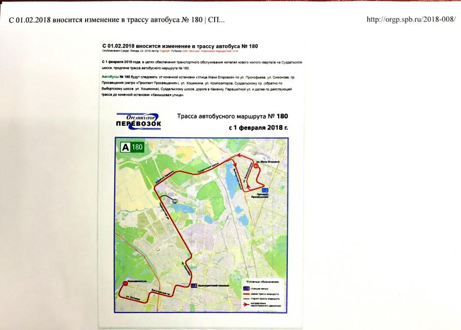 С 1 февраля 2018 года, в целях обеспечения транспортного обслуживания жителей нового жилого квартала на Суздальском шоссе, продлевается трасса автобусного маршрута № 180.