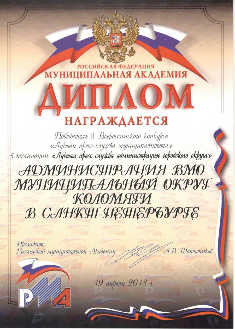 Награждение провел советник Мэра г. Москвы, вице-президент Российской муниципальной академии профессор Владимир Борисович Зотов. По словам организаторов, на конкурс было подано более 50 заявок из разных городов России. Пресс-служба МО Коломяги стала победителем в номинации «Лучшая пресс-служба администрации городского округа».
