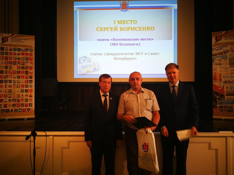 Газета «Коломяжские вести» стала победителем в номинации «Лучшая публикация о местном самоуправлении», где I место присуждено Главе МО Коломяги Сергею Эдуардовичу Борисенко за статью «Двадцатилетие МСУ в Санкт-Петербурге».