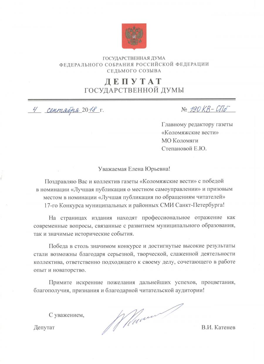 Депутат Государственной Думы ФС РФ Владимир Иванович Катенев поздравил главного редактора газеты «Коломяжские вести» Елену Юрьевну Степанову за победы на конкурсе. «На страницах Вашего издания находят профессиональное отражение как современные вопросы, связанные с развитием муниципального образования, так и значимые события. Победа в столь значимом конкурсе и достигнутые высокие результаты стали возможны, благодаря серьезной, творческой, слаженной деятельности коллектива, ответственно подходящего к своему делу, сочетающего опыт и новаторство».