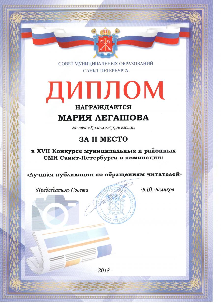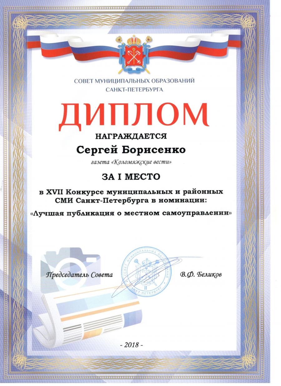 6 сентября 2018 года в Доме журналиста Санкт-Петербурга состоялась торжественная церемония награждения победителей XVII Конкурса муниципальных и районных СМИ, организованного Советом муниципальных образований города и Союзом журналистов Санкт-Петербурга.