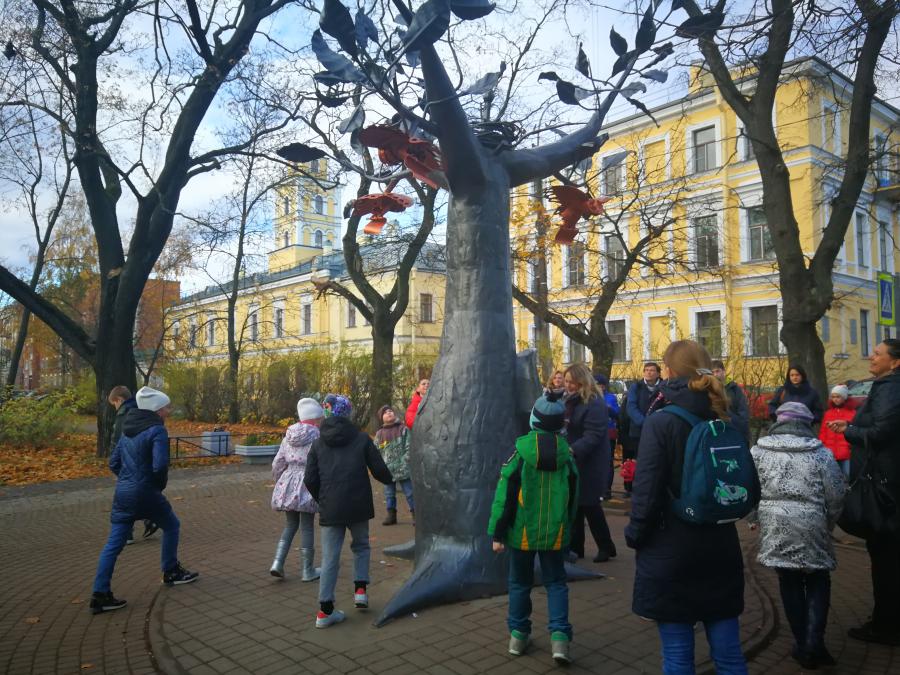 Особенно юным коломяжцам понравилась скульптура в виде Дерева желаний. По поверьям, чтобы желание исполнилось, нужно закинуть монету в гнездо к совятам на верхушке дерева и при попадании обежать три раза вокруг ствола. На этом обряд не заканчивается — свою заветную мечту нужно прошептать на ухо, которое расположено сбоку на стволе дерева. Попасть монеткой в гнездо оказалось не так-то просто, но несмотря на это, свое желание чугунному дереву прошептали все участники экскурсии.
