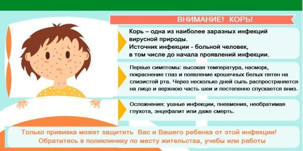 Корь – одна из наиболее заразных инфекций вирусной этиологии, которая передается по воздуху от человека к человеку. Заболевание характеризуется лихорадкой, катаральным воспалением конъюнктивы и слизистых верхних дыхательных путей, этапными пятнисто-папулезными высыпаниями на коже, начиная с головы и далее на туловище и конечности. Для того чтобы не допустить распространения кори среди населения города необходимо своевременное выявление и изоляция больных. При подозрении на заболевание корью врача необходимо вызвать на дом, при необходимости  больной госпитализируется в инфекционный стационар.