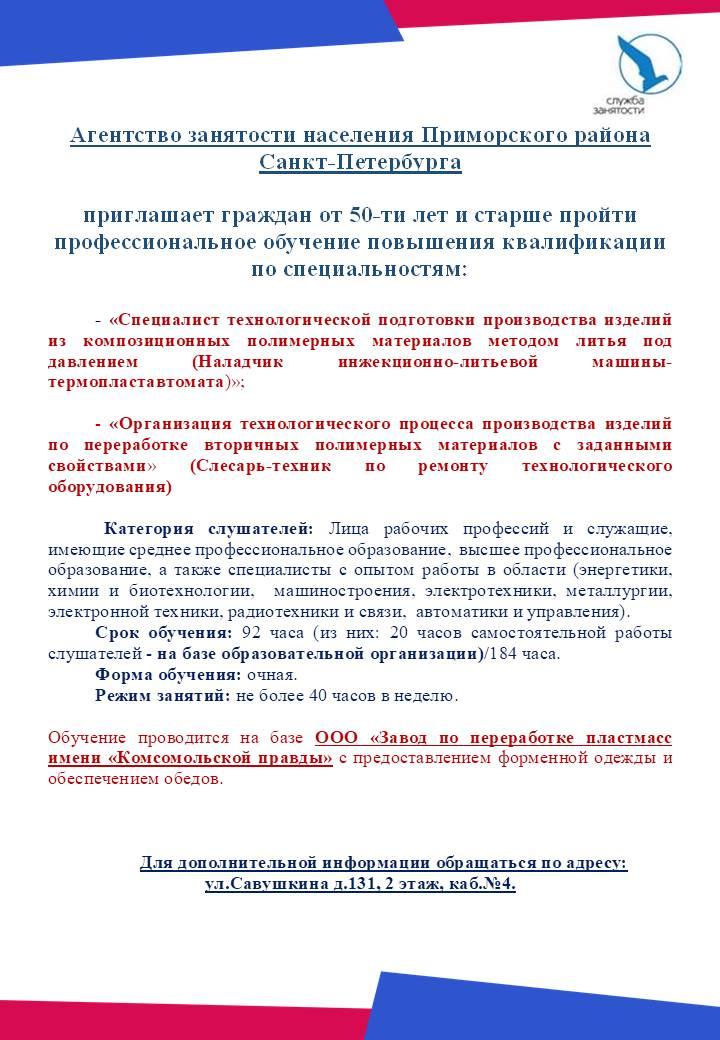 Агентство занятости населения Приморского района приглашает граждан от 50-ти лет и старше пройти профессиональное обучение повышения квалификации!