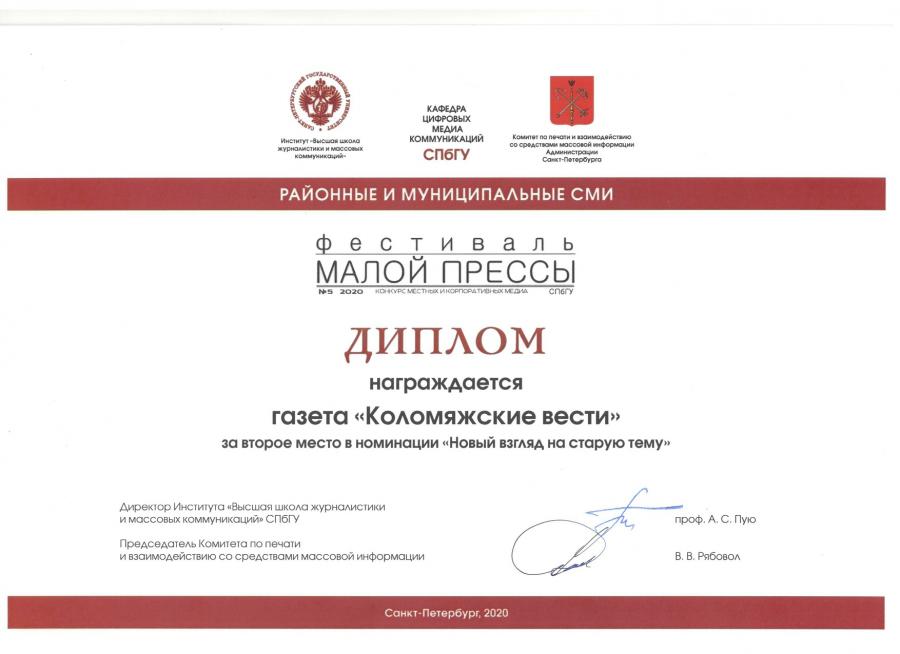 По итогам фестиваля в номинации «Новый взгляд на старую тему» II место заняла газета «Коломяжские вести» со статьей «О чем мечтает старшее поколение» (автор – Мария Легашова). Организаторы фестиваля отметили, что эта статья привлекла их внимание трогательными человеческими судьбами жителей Дома-Интерната для престарелых и инвалидов №1 (ДИПИ №1), представленными в необычном формате.