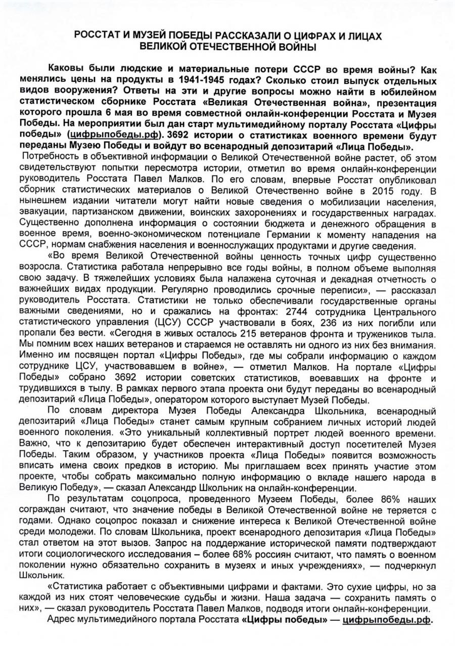 «Во время Великой Отечественной войны ценность точных цифр существенно возросла. Статистика работала непрерывно все годы войны, в полном объеме выполняя свою задачу. В тяжелейших условиях была налажена суточная и декадная отчетность о важнейших видах продукции. Регулярно проводились срочные переписи», — рассказал руководитель Росстата. Статистики не только обеспечивали государственные органы важными сведениями, но и сражались на фронтах: 2744 сотрудника Центрального статистического управления (ЦСУ) СССР участвовали в боях, 236 из них погибли или пропали без вести. «Сегодня в живых осталось 215 ветеранов фронта и тружеников тыла. Мы помним всех наших ветеранов и стараемся не оставлять ни одного из них без внимания. Именно им посвящен портал «Цифры Победы», где мы собрали информацию о каждом сотруднике ЦСУ, участвовавшем в войне», — отметил Малков. На портале «Цифры Победы» собрано 3692 истории советских статистиков, воевавших на фронте и трудившихся в тылу. В рамках первого этапа проекта они будут переданы во всенародный депозитарий «Лица Победы», оператором которого выступает Музей Победы.