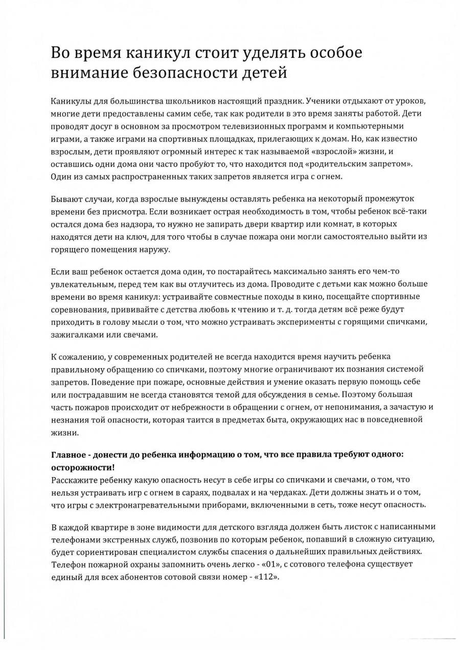 Каникулы для большинства школьников настоящий праздник. Ученики отдыхают от уроков, многие дети предоставлены самим себе, так как родители в это время заняты работой. Дети проводят досуг в основном за просмотром телевизионных программ и компьютерными играми, а также играми на спортивных площадках, прилегающих к домам. Но, как известно взрослым, дети проявляют огромный интерес к так называемой «взрослой» жизни, и оставшись одни дома они часто пробуют то, что находится под «родительским запретом». Один из самых распространенных таких запретов является игра с огнем.