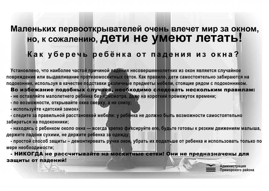 Частой причиной падения несовершеннолетних из окон является случайное повреждение или выдавливание противомоскитных сеток. Как правило, дети самостоятельно забираются на подоконник, используя в качестве подставки различные предметы мебели, стоящие рядом с подоконником.