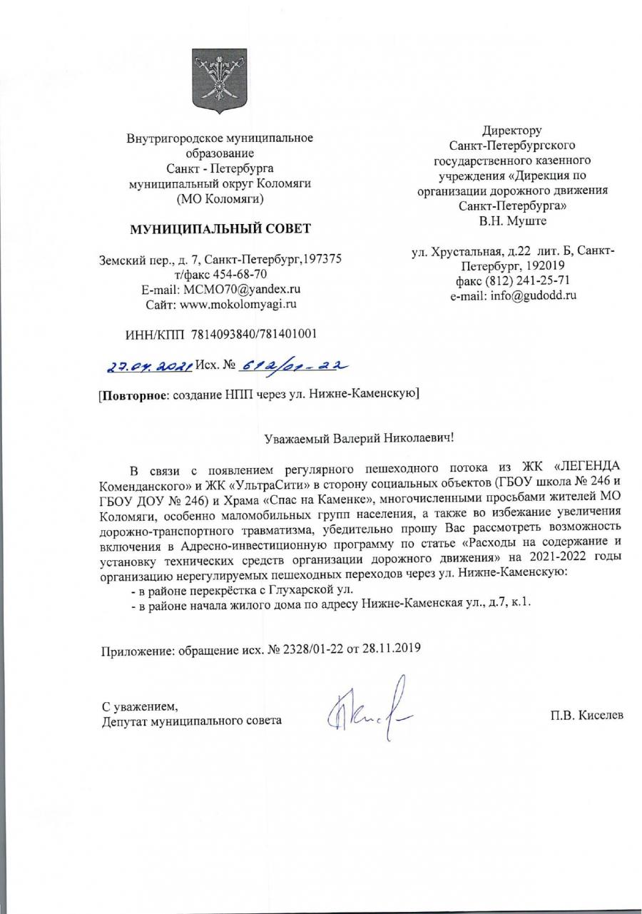 Депутат Муниципального Совета Киселев П.В. отправил повторное обращение в ГКУ ДОДД относительно необходимости обустройства наземных пешеходных переходов через Нижне-Каменскую ул.
