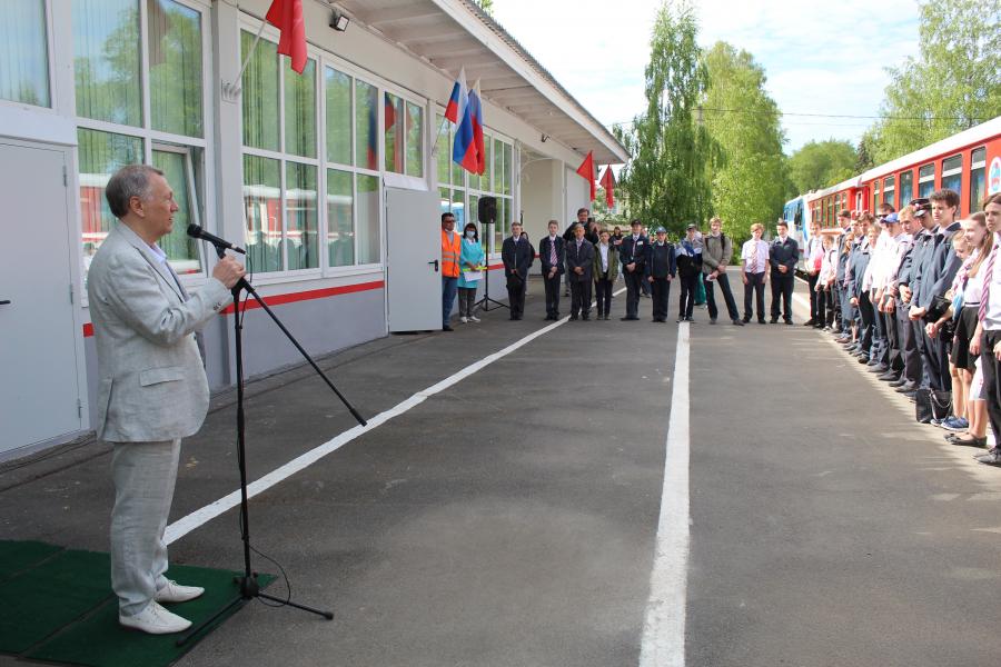Начальник МОЖД Владимир Борисович Чиликин поприветствовал ребят и рассказал об истории детской железной дороги: «Южная трасса, которую мы открывали вчера, пролегает по насыпи первой Царскосельской железной дороги. У нас там стоит паровоз Проворный, который отреставрирован, и многие из вас его уже видели или увидят. А вот Северная трасса отличается — это бывшая Приморская железная дорога 1876 года. Когда вы пойдете вдоль рельс, обратите внимания на клейма – 1876 год, 1911 год. Эти рельсы видели революцию, войну, перестройку, и мы с вами по ним сейчас ездим. Здесь любили отдыхать поэты серебряного века. Александр Блок написал «Незнакомку» между станциями Озерная и Шувалово. Вся эта богатая история доверена нам, и мы должны ее сберечь».