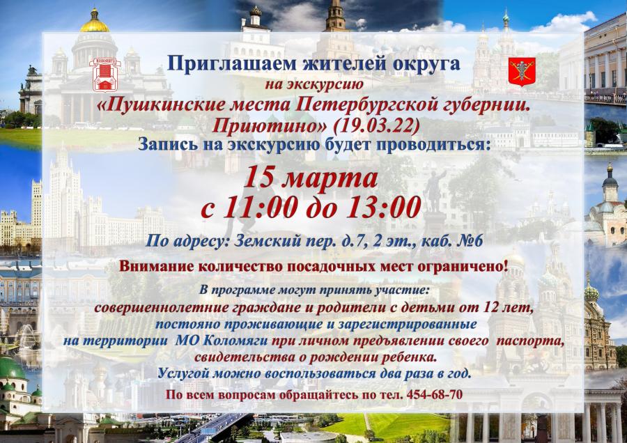 Экскурсии для совершеннолетних граждан и родителей с детьми от 12 лет, постоянно зарегистрированных на территории МО Коломяги