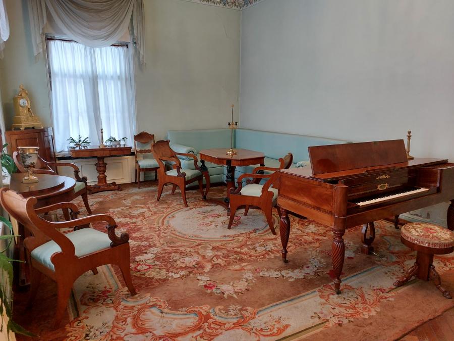 В разные годы в петербургском доме Олениных и их загородной усадьбе гостили многие великие поэты, писатели, художники, музыканты, актеры. Здесь часто бывал великий баснописец Иван Андреевич Крылов, которого хозяева дома ласково называли «Крылочка». По словам экскурсовода, Иван Андреевич был очень ленив и написал так много басен только благодаря хозяйке дома Елизавете Марковне. Она пыталась заставлять его работать – запирала Ивана Андреевича на ключ в комнате на два дня и носила туда кушанья. Он же добродушно терпел затворничество и относился к хозяйке дома как к матери, несмотря на то что они были почти одного возраста.