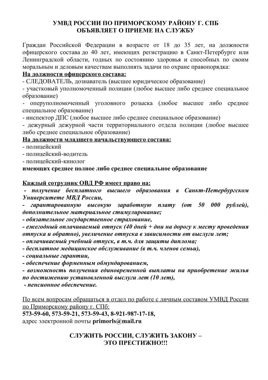По всем вопросам обращаться в отдел по работе с личным составом УМВД России по Приморскому району г. СПб: