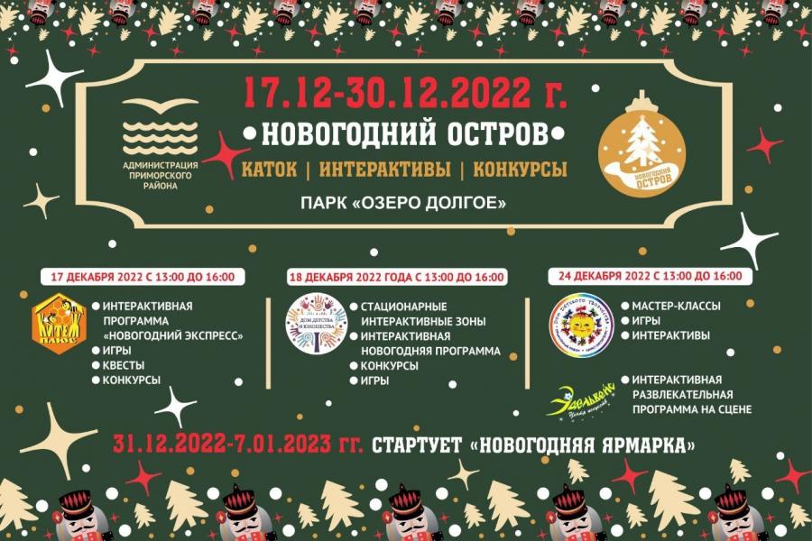 С 17 декабря, с первых предновогодних выходных, начнутся культурно-развлекательные программы для жителей Приморского района. А с 31 декабря 2022 года по 7 января 2023 года будет работать Рождественская ярмарка.