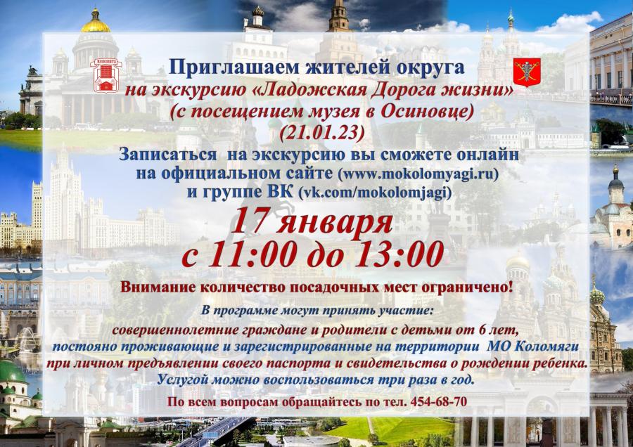 Экскурсии для совершеннолетних граждан и родителей с детьми от 6 лет, постоянно зарегистрированных на территории МО Коломяги.