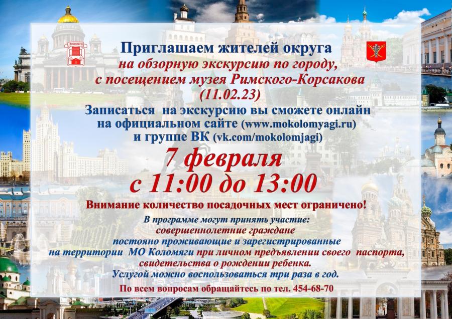 - Экскурсия для совершеннолетних граждан и родителей с детьми от 6 лет, постоянно зарегистрированных на территории МО Коломяги