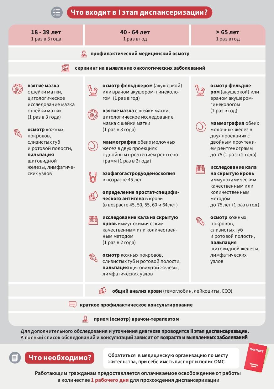 На 1 этапе диспансеризации проводятся: опрос (анкетирование), антропометрия (измерение роста стоя, массы тела, окружности талии), расчет индекса массы тела, измерение артериального давления; определение уровня общего холестерина в крови, определение уровня глюкозы в крови, определение относительного и абсолютного суммарного сердечно-сосудистого риска; электрокардиография в покое, осмотр фельдшером (акушеркой), флюорография лёгких, маммография обеих молочных желез, исследование кала на скрытую кровь иммунохимическим методом, измерение внутриглазного давления, приём (осмотр) врача-терапевта.