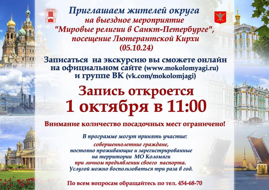 - Экскурсия для совершеннолетних граждан от 18 лет, постоянно зарегистрированных на территории МО Коломяги