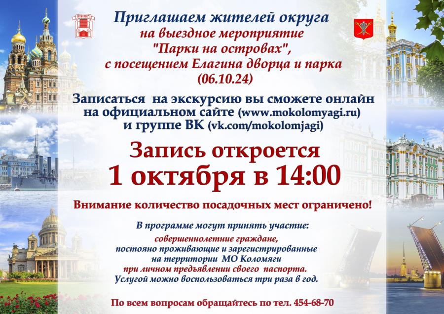 Приглашаем совершеннолетних граждан (18+) посетить бесплатное выездное мероприятие «Парки на островах», с посещением Елагина дворца и парка