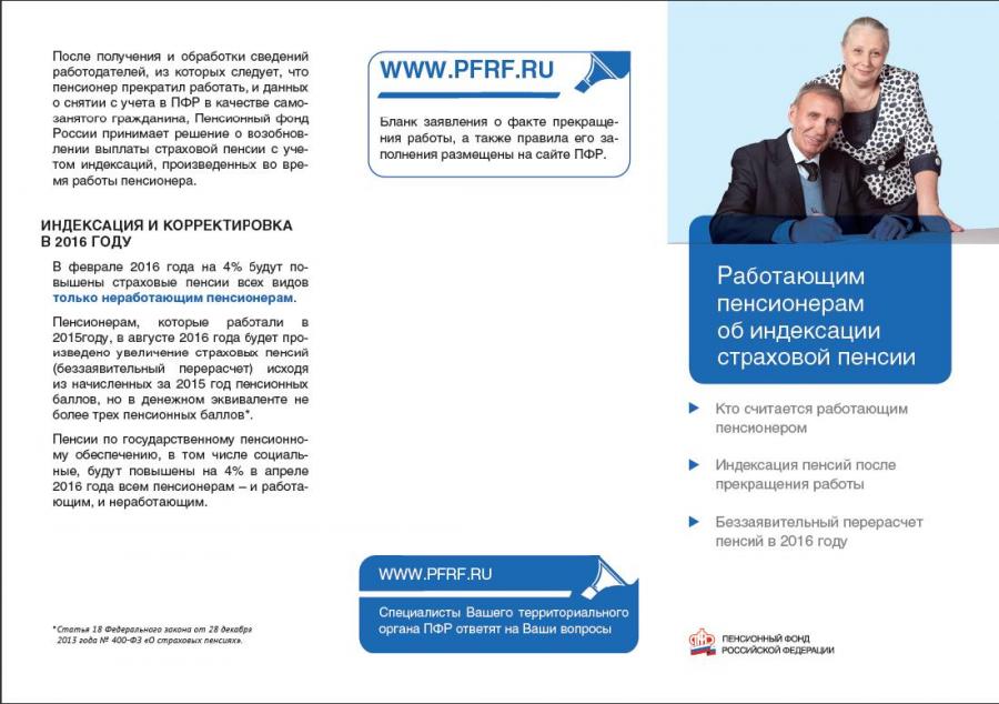 Таким образом, Пенсионный фонд Российской Федерации рекомендует всем пенсионерам – получателям страховых пенсий, которые прекратили трудовую деятельность после 30 сентября 2015 года, своевременно подать заявление в ПФР для получения страховой пенсии с учетом февральской индексации.