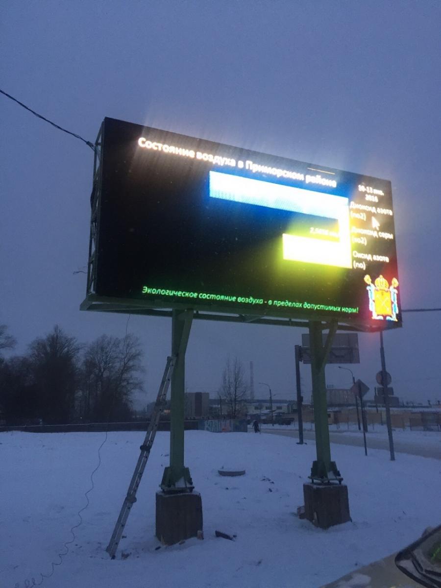 Информационный щит 6×3 м (24 светодиодные панели) установлен на высоте 3 м и дистанционно скоммутирован с компьютером, специально приобретенным для реализации задачи вывода информации мониторинговой лаборатории на экран. Эксплуатировать технику предстоит СПб ГУП «Минерал» - предприятию, подведомственному Комитету по природопользованию, охране окружающей среды и обеспечению экологической безопасности. Все работы по приобретению, доставке и монтажу конструкции выполнены за счет средств предприятий «АБЗ-1» и «ВАД».
