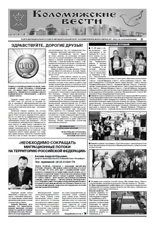Уважаемые читатели, на сайте 100-й выпуск газеты "Коломяжские вести", №6, июнь, 2016 - mokolomyagi.ru/files/file/gazeta06_16.pdf