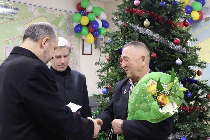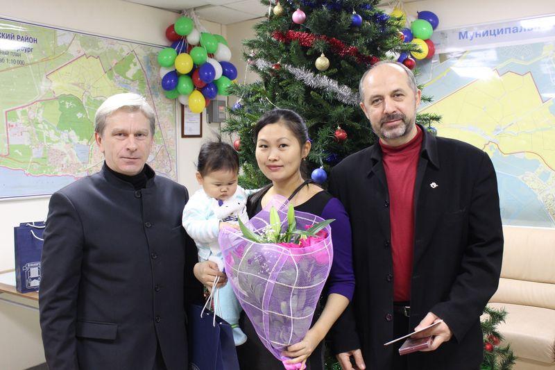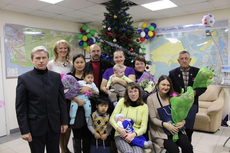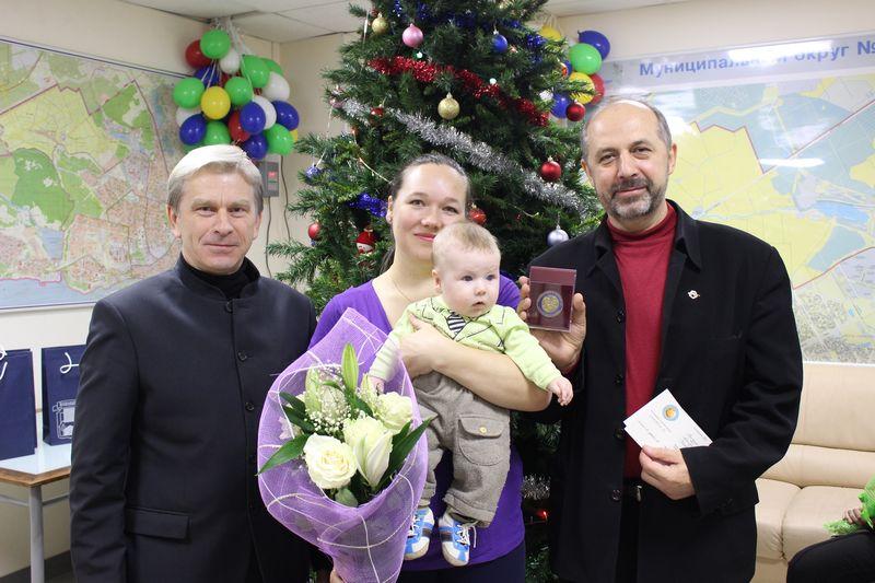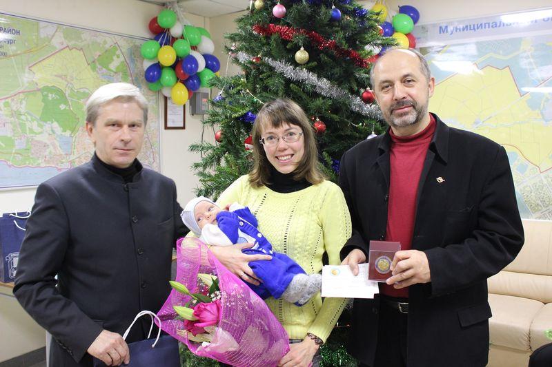 В преддверии новогодних праздников вручение памятных медалей «Рожденному в Коломягах» прошло у новогодней елочки, расположенной в холле муниципалитета. Поздравили присутствовавших депутаты Муниципального Совета Владимир Иванович Когут, Вячеслав Иванович Бороденчик и сотрудник местной администрации Марина Борисовна Сурикова.