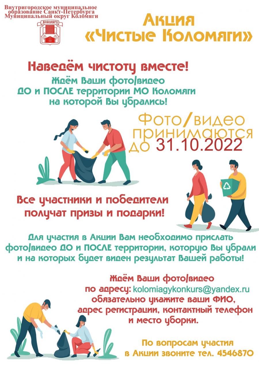 Уважаемые жители! Продолжается прием Ваших фото/видео материалов в рамках проведения Акции "Чистые Коломяги", ждём Ваши фото/видео по адресу: kolomiagykonkurs@yandex.ru