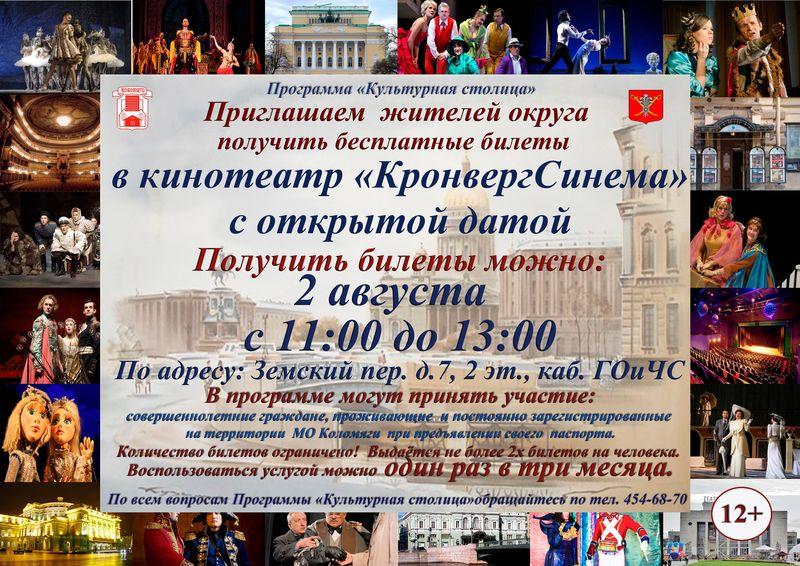 Выдача билетов состоится 2 августа по адресу: Земский пер., д.7, 2 этаж, с 11.00-13.00