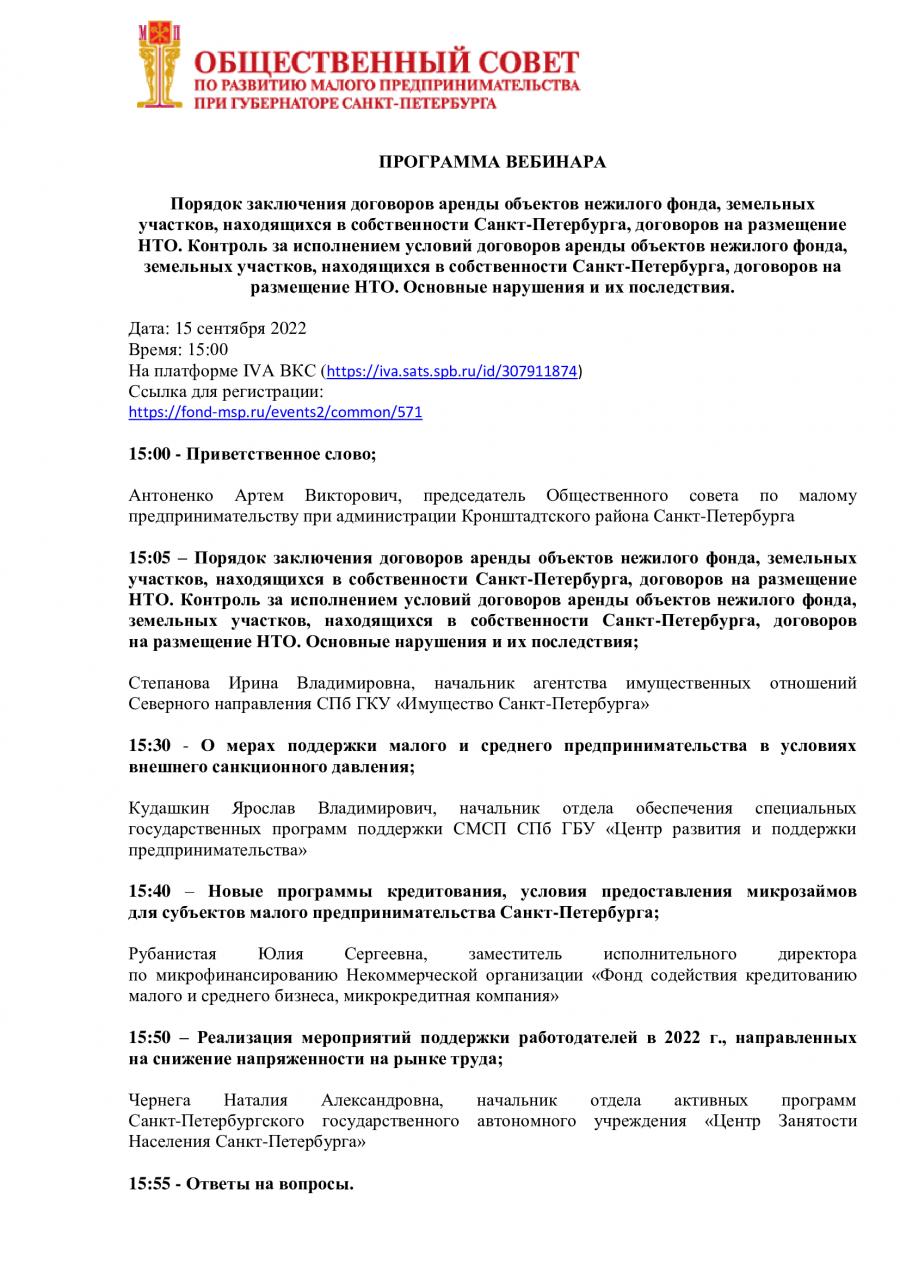 15 сентября 2022 года в 15:00 Общественный Совет по малому предпринимательству при главе администрации Приморского района Санкт-Петербурга в рамках реализации плана мероприятий по развитию малого бизнеса на территории Приморского района организует проведение бесплатного онлайн вебинара для субъектов малого предпринимательства на тему: «Порядок заключения договоров аренды объектов нежилого фонда, земельных участков, находящихся в собственности Санкт-Петербурга, договоров на размещение НТО. Контроль за исполнением условий договоров аренды объектов нежилого фонда, земельных участков, находящихся в собственности Санкт-Петербурга, договоров на размещение НТО. Основные нарушения и их последствия».