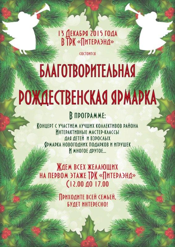 13 декабря в ТРК «Питерлэнд» (Приморский пр., 72) с 12.00 будет проходить Благотворительная Рождественская ярмарка. На ярмарке будут представлены новогодние игрушки, сувениры и детские hand-made работы, купив которые можно подарить частичку радости детям-инвалидам и их семьям. Все средства от продажи будут переведены на счет Автономной некоммерческой организации «Партнерство каждому ребенку», а именно в счет программы «Передышка». Программа дает возможность родителям детей с инвалидностью получить помощь специально обученной профессиональной семьи, доверив ей на некоторое время заботу о ребенке.