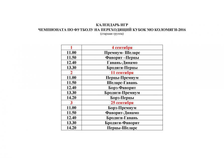 Уважаемые игроки! Настало время продолжить игры в рамках чемпионата по футболу за переходящий кубок МО Коломяги-2016. Составлен календарь игр, согласно которому, первая игра состоится 4 сентября в 11.00 на стадионе школы №634. Заявки на внесение изменений в расписании игр принимаются ДО 2 СЕНТЯБРЯ! При отсутствии команды в назначенное время в игровой день будет засчитываться техническое поражение. Просим отнестись с пониманием и предупреждать заранее. Телефон для связи: +7-999-246-52-09 Дмитрий Егоров, МБУ "Развитие".