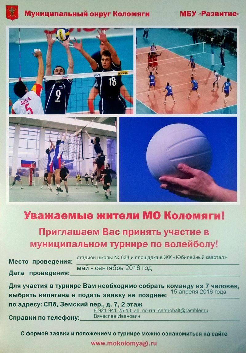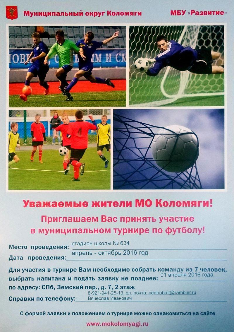 МО Коломяги и МБУ "Развитие" приглашают жителей нашего округа принять участие в чемпионатах по футболу и волейболу на Переходящий кубок МО КОЛОМЯГИ, которые будут проводится с апреля по сентябрь 2016 г. К участию допускаются лица старше 14-ти лет. Состав команды - 7 человек.