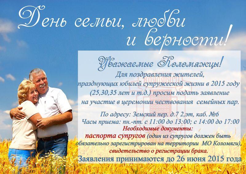 Уважаемые жители! Приглашаем вас принять участие в церемонии чествования семейных пар.