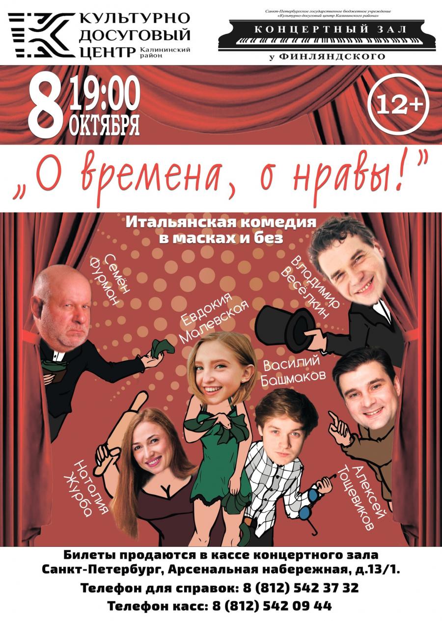 Итальянская комедия – это кипящие страсти, это водоворот событий, это яркие персонажи и непредсказуемый сюжет. «О времена, о нравы!». Итальянская комедия в масках и без…» - постановка по мотивам итальянских комедий и пьесы «Цилиндр» классика итальянской драматургии Эдуардо Де Филиппо, которую сам автор считал лучшей своей пьесой. Этот спектакль и рассмешит Вас, и натолкнет на размышления; Вместе с героями пьесы Вы будете смеяться и негодовать, веселиться и грустить, любить и ненавидеть...