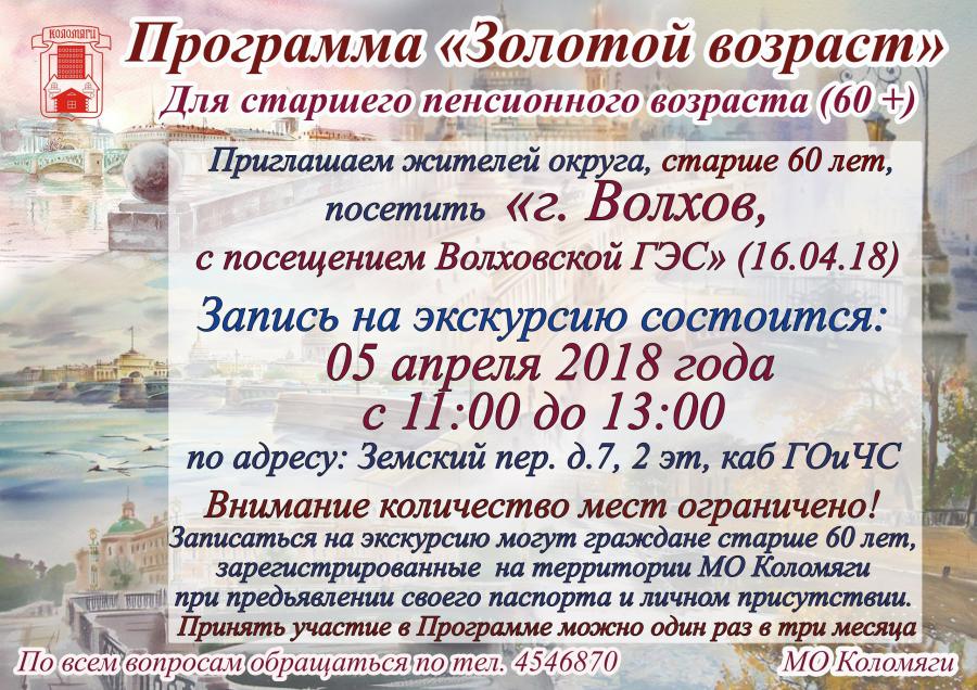 Запись на экскурсию по программе "Золотой возраст" состоится 5 апреля 2018 года. Запись на одноименную экскурсию для жителей округа состоится 10 апреля 2018 года.