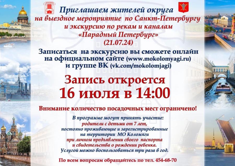 - Экскурсия для родителей с детьми от 7 лет, постоянно зарегистрированных на территории МО Коломяги, на экскурсию может поехать только 1 сопровождающий родитель