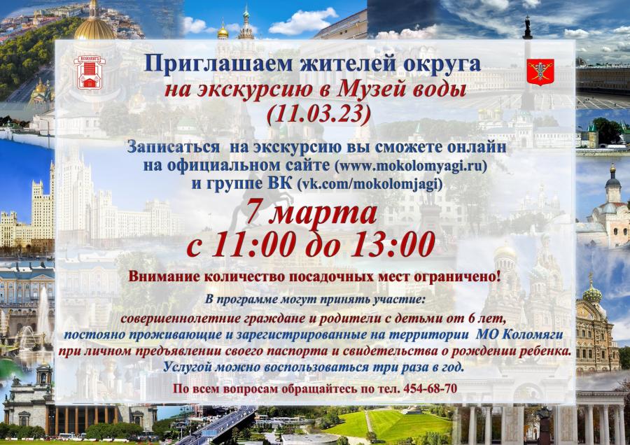 - Экскурсия для совершеннолетних граждан (от 18 лет) и родителей с детьми от 6 лет, постоянно зарегистрированных на территории МО Коломяги