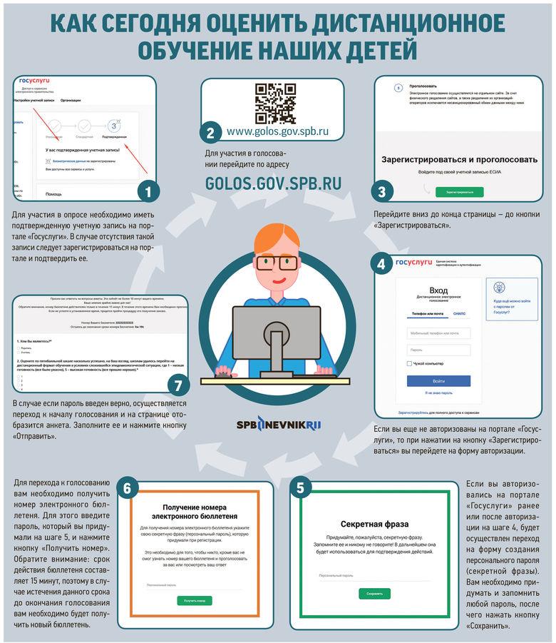 Сегодня, 25 мая 2020 года, с 10 до 14 на сайте golos.gov.spb.ru пройдет электронное голосование, с помощью которого горожане получат возможность оценить систему дистанционного обучения школьников. Родителям школьников и учителям предлагают оценить дистанционную часть учебного года и заодно протестировать петербургскую разработку электронного голосования.