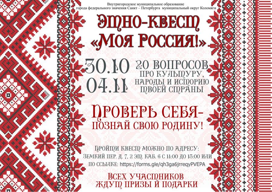 Дорогие жители! Ко Дню народного единства мы приглашаем Вас принять участие в ежегодном этно-квесте "Моя Россия"!