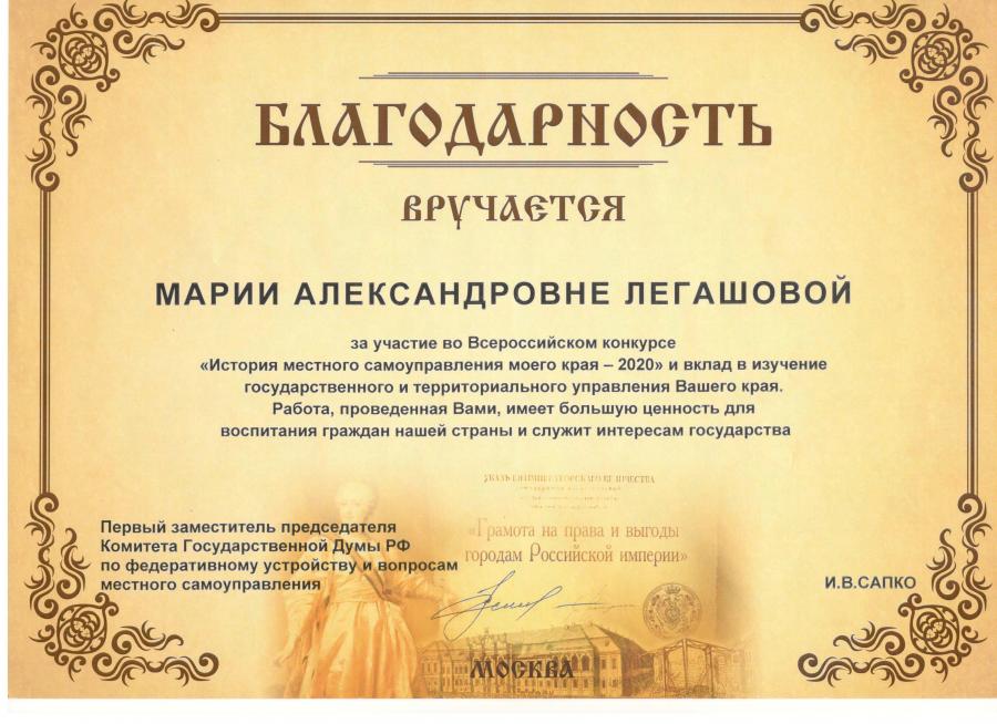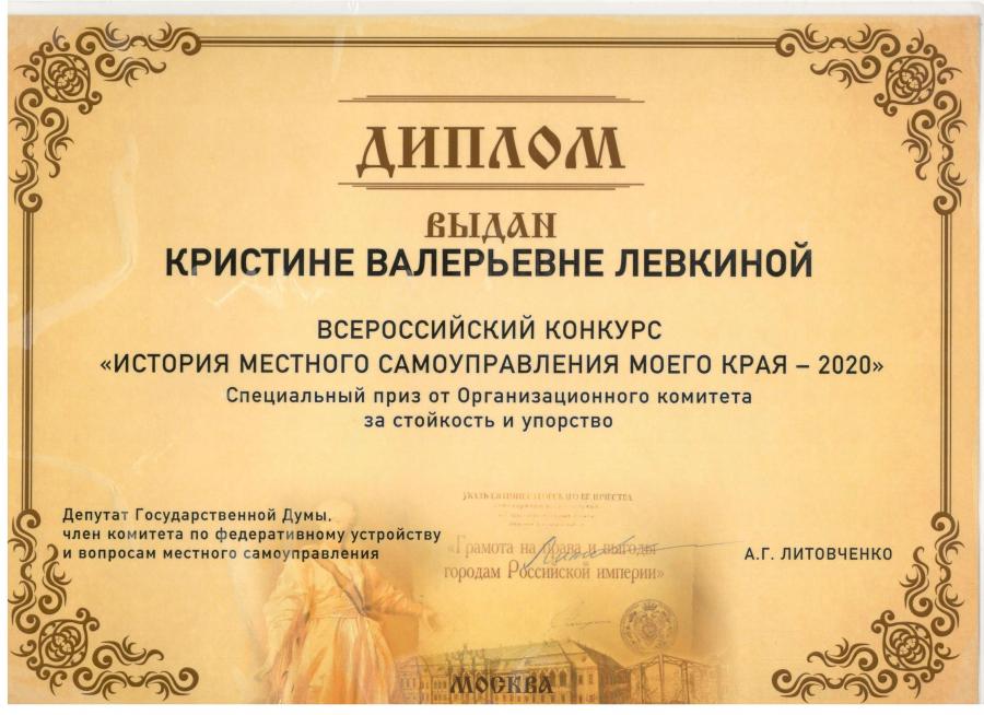 C 16 по 18 сентября 2020 года состоялся финал Всероссийского конкурса «История местного самоуправления моего края». Конкурс проводился АНО «Институт развития местных сообществ» и ФГБУН «Институт российской истории Российской академии наук» при поддержке Комитета Государственной Думы по федеративному устройству и вопросам местного самоуправления.