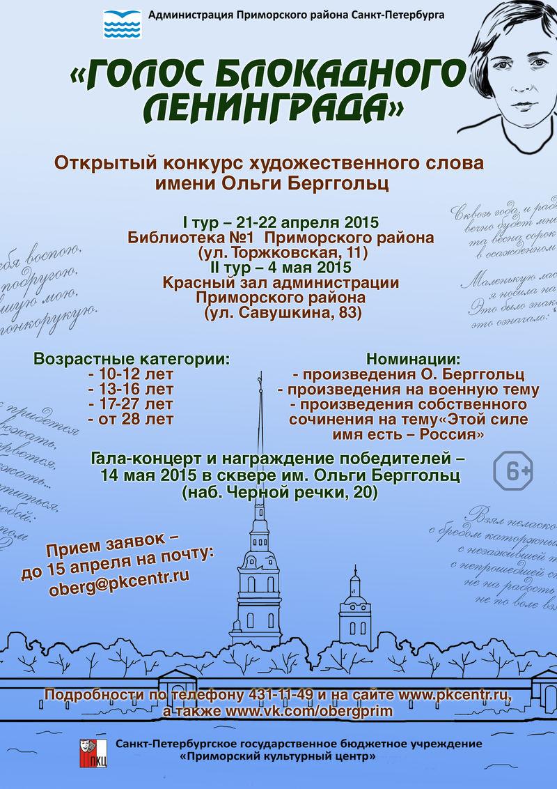 С 21 апреля по 14 мая 2015 года в Приморском районе в рамках празднования 70-ти летнего юбилея Победы в Великой Отечественной Войне впервые пройдет Открытый конкурс художественного слова имени Ольги Берггольц  «Голос блокадного Ленинграда». Участники конкурса в возрасте от 10 лет (без ограничений предельного возраста участия) исполнят не только поэтические произведения Ольги Берггольц – настоящеймузы блокадного Ленинграда – также прозвучат произведения на военную тему и авторские произведения на тему «Этой силе имя есть - Россия». В жюри конкурса войдут известные театральные деятели и поэты Санкт-Петербурга.