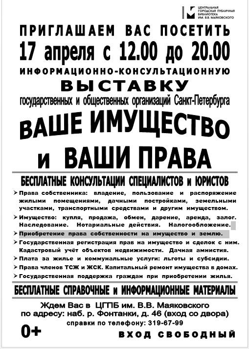 Огромное количество людей волнуют подобные вопросы, касающиеся их имущества. Ответы на них можно будет получить на информационно-консультационной выставке государственных и общественных организаций Санкт-Петербурга «ВАШЕ ИМУЩЕСТВО и ВАШИ ПРАВА».