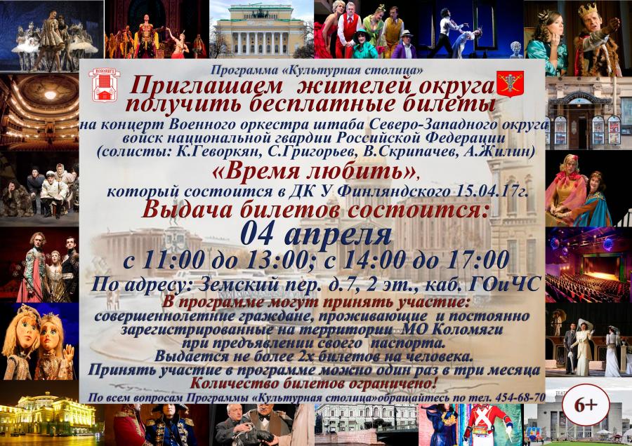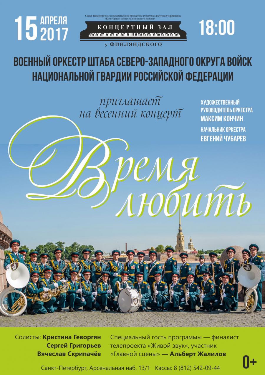 Приглашаем жителей получить бесплатные билеты на концерт Военного оркестра Северо-Западного округа войск национальной гвардии Российской Федерации "Время любить". Оркестр подготовил романтичную, яркую, по-настоящему весеннюю программу из популярных советских и эстрадных песен - «Время любить». Публику порадуют любимые песни из репертуара Муслима Магомаева, аранжировки мелодий из советских и голливудских кинофильмов. Исполнят хиты мировой классики и эстрады в оригинальном звучании духового оркестра. Специальный гость Альберт Жалилов.