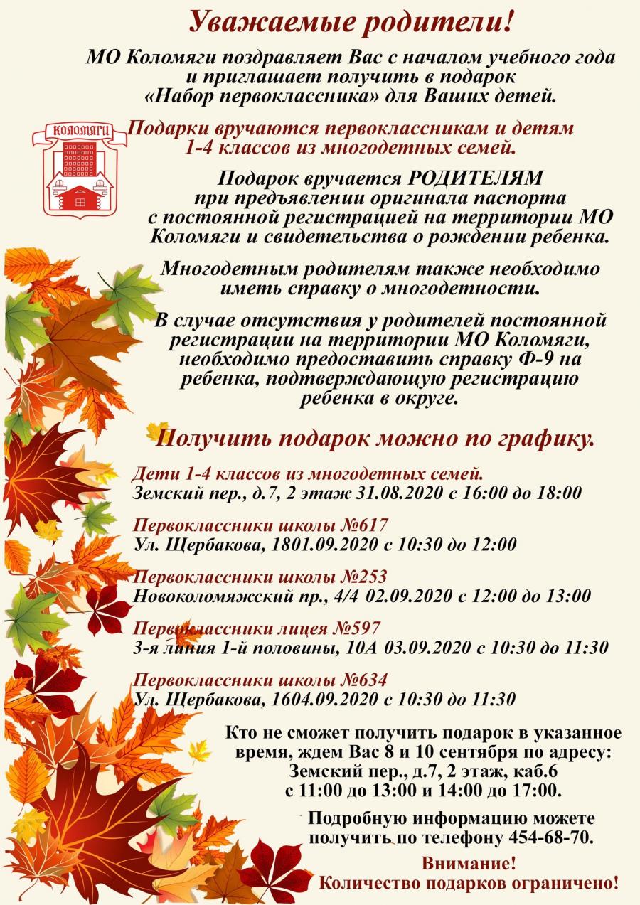 МО Коломяги приглашает получить подарки для первоклассников и учеников 1-4 классов из многодетных семей!