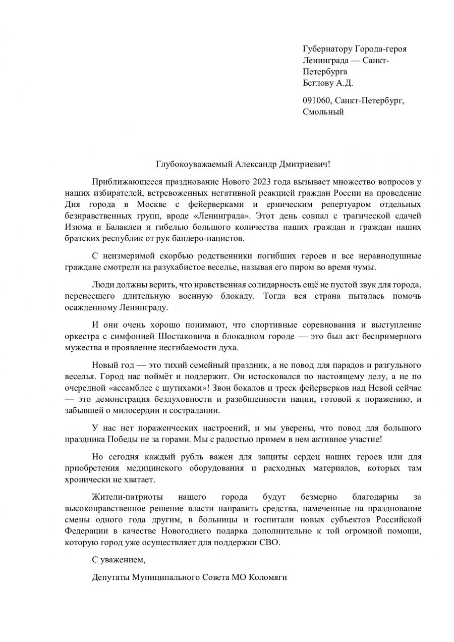 Обращение к Губернатору Санкт-Петербурга А.Д. Беглову от депутатов Муниципального Совета