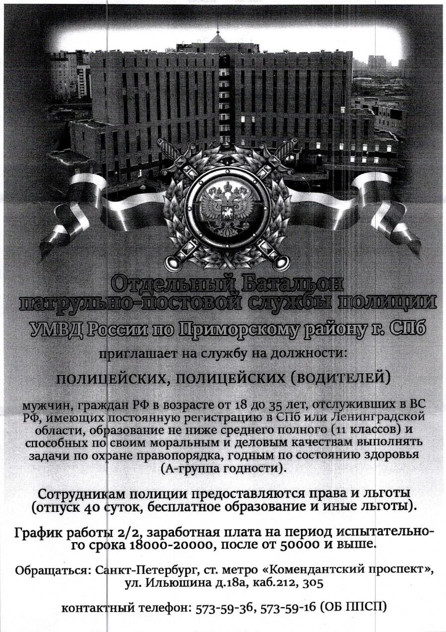 Отдельный Батальон патрульно-постовой службы полиции по Приморскому району приглашает на работу